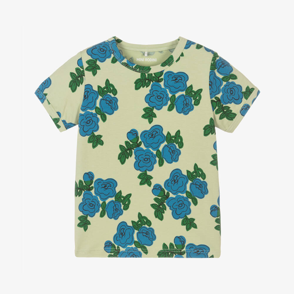 Green and blue jersey T-shirt for girls by Swedish brand Mini Rodini, made in soft organic cotton. This round neck style is patterned with pretty hand-drawn roses, giving this tee a unique Mini Rodini look. It is designed for a slim fit.
