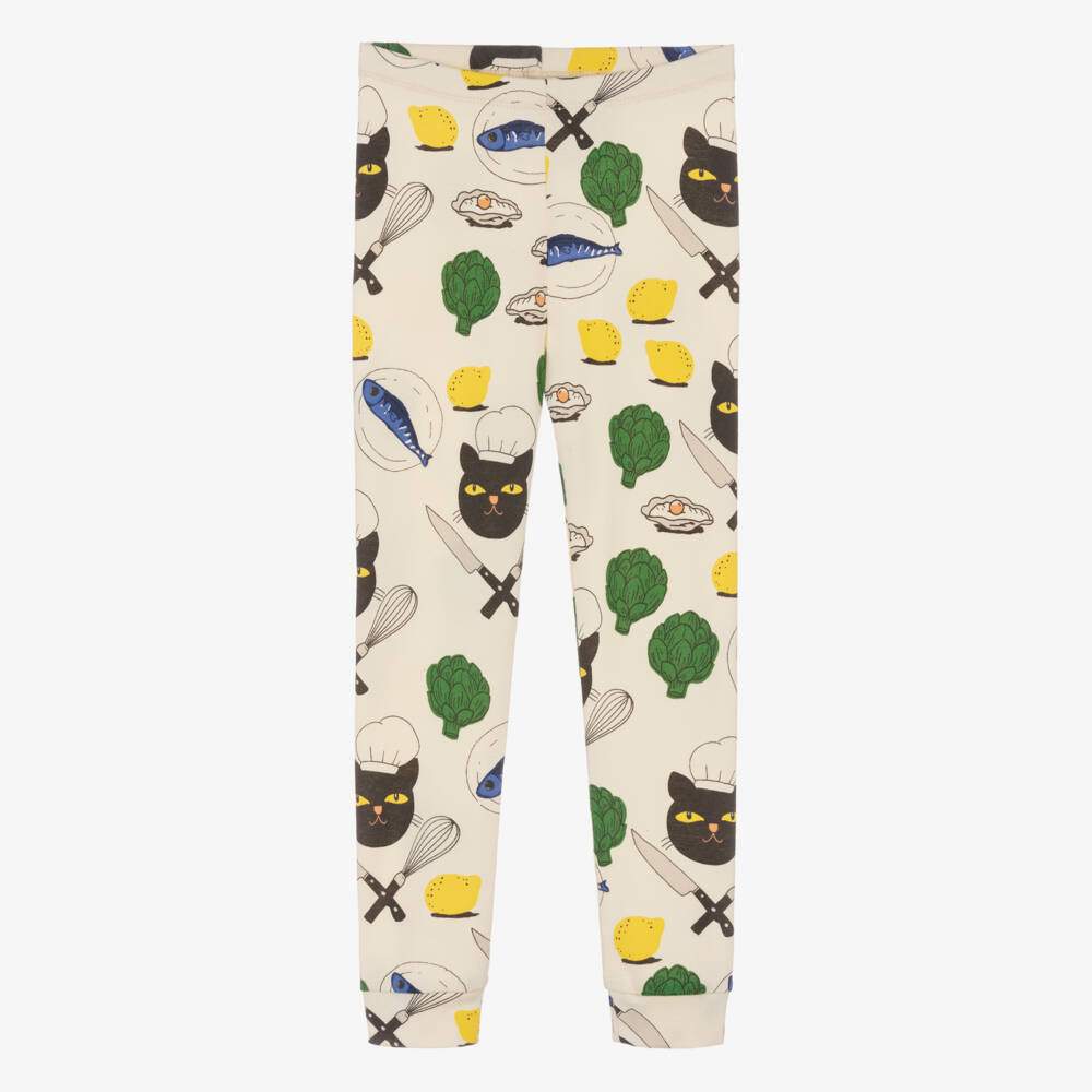 Easy-to-wear, these ivory jersey leggings for girls are from Mini Rodini, made in soft organic cotton. A black chef cat is printed with it's cooking utensils all-over, alongside various vegetables and seafood for a quirky look.