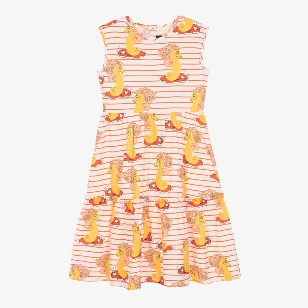 An ivory dress for girls by Mini Rodini, woven in soft and lightweight organic cotton. Creative and imaginative, this dress is patterned in red stripes, with yellow unicorn seahorses. It has a ruffled tier on the hem and useful popper fastenings on the back.