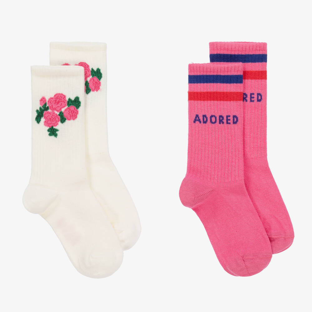 Super pretty, these socks for girls by Mini Rodini come in a lovely pack of two. Soft and stretchy, they are made from a comfortable organic cotton knit with ribbed detailing around the ankle. The ivory pair have a charming rose motif and the pink pair have blue and red stripes with the word 'adored', for a fun and quirky look.