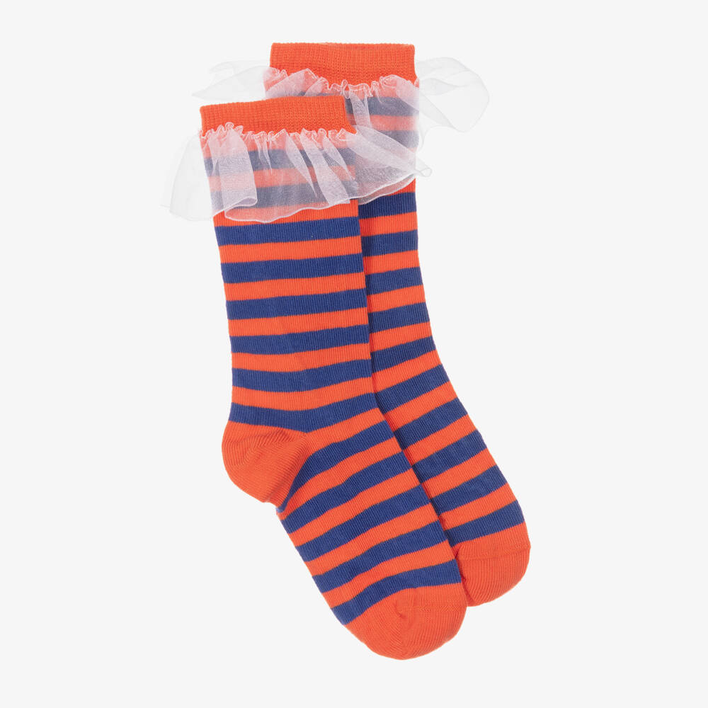 Bright orange and blue striped socks for girls by Mini Rodini, made from a comfortable organic cotton knit. Fun and quirky, they have a shimmery white tulle ruffle around the ankle for a cute finish. Soft and stretchy, they will add a pop colour to any outfit.