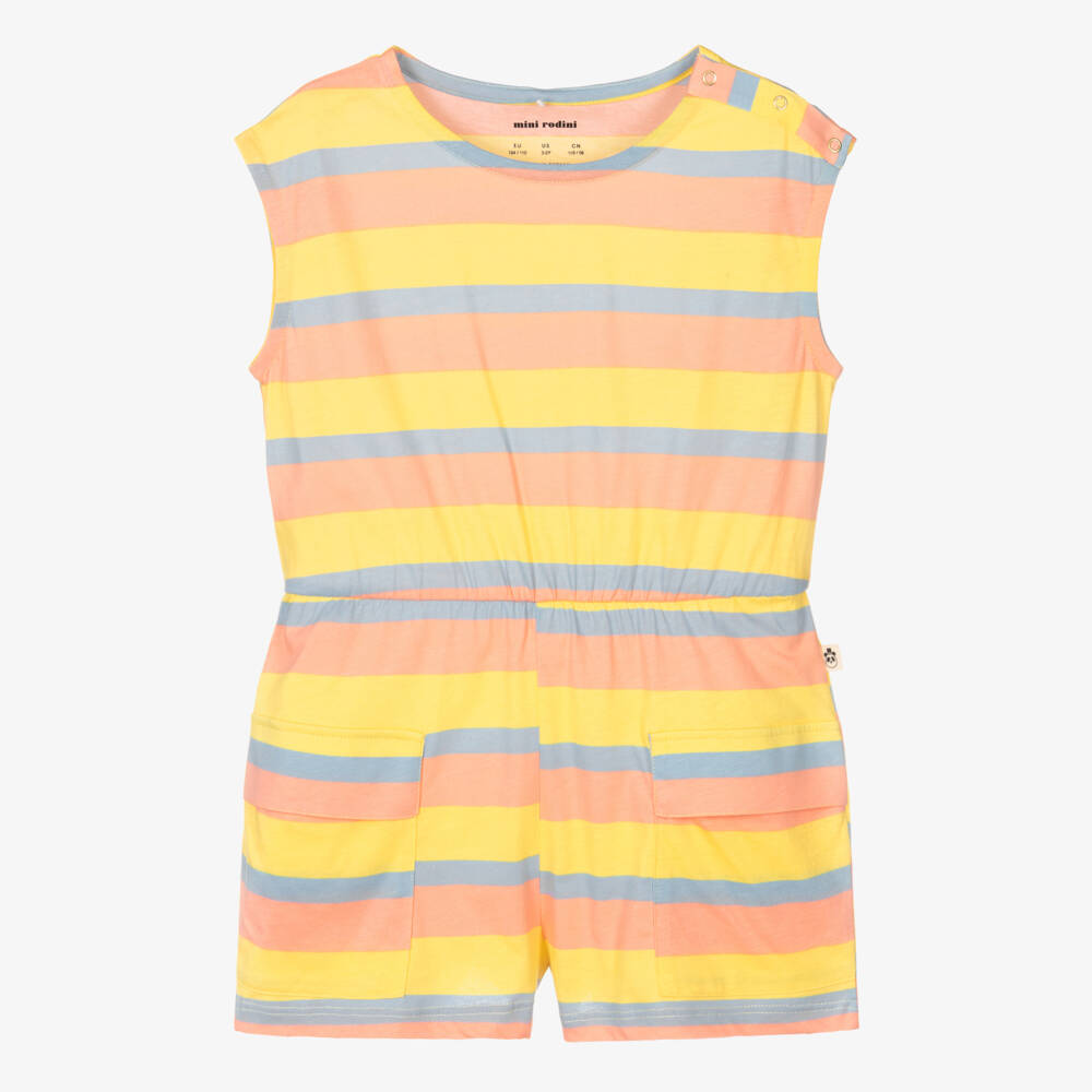 Striped organic cotton playsuit for girls by Mini Rodini, in pastel shades of pink, blue and yellow. Designed with comfort in mind, this jersey playsuit has an elasticated waist and popper fastenings on one shoulder. There are flap pockets on the legs and a branded tab on the side seam for a subtle designer finish.