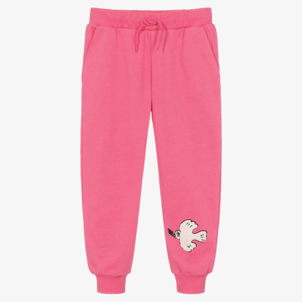 Pink joggers for girls by Mini Rodini, made in super soft organic cotton jersey. In collaboration with Wrangler, they have an ivory dove appliqué on one leg for a fun yet casual look. There is a drawstring waist for a great fit, side pockets and cuffed ankles.