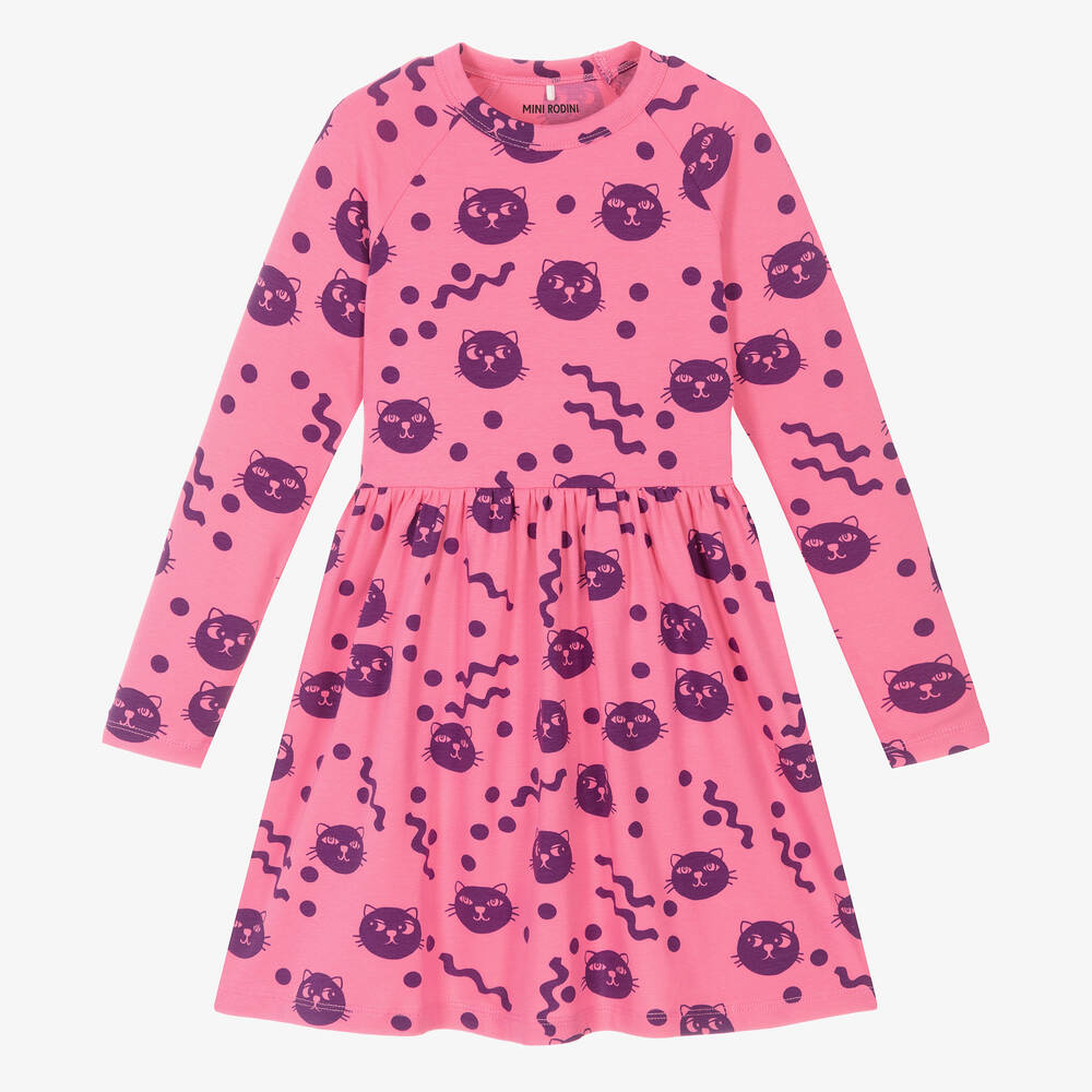 Fun and casual vibrant pink dress for girls by Mini Rodini, with a cute purple cat and squiggly pattern. Made in super soft and comfortable organic cotton jersey, it has raglan long sleeves and a simple gathered waist.