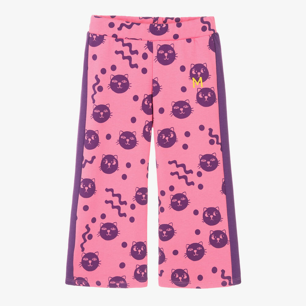 Fun and vibrant pink wide-leg joggers for girls by Mini Rodini, patterned with cute purple cats and squiggly motifs. They are made in mid-weight organic cotton jersey with matching trims and a yellow embroidered initial on the front. For an adjustable fit, the gently elasticated waist has an internal drawstring.