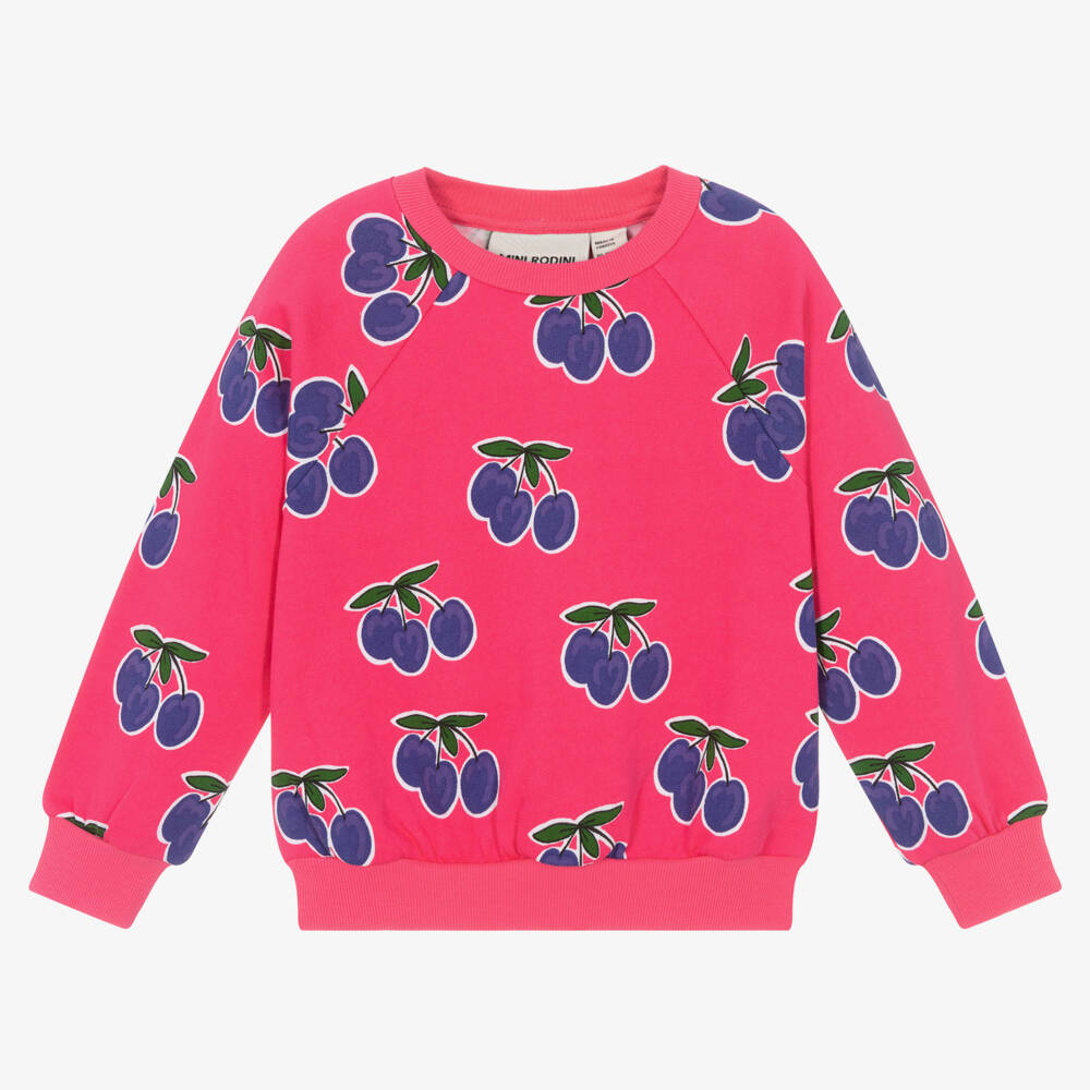 Eye-catching fuchsia pink sweatshirt for girls by Mini Rodini, with a bold plum pattern in purple and green. Super comfortable, it is made in mid-weight organic cotton jersey with a cosy brushed feel inside. This casual top has raglan sleeves and soft ribbed trims to complete the look.