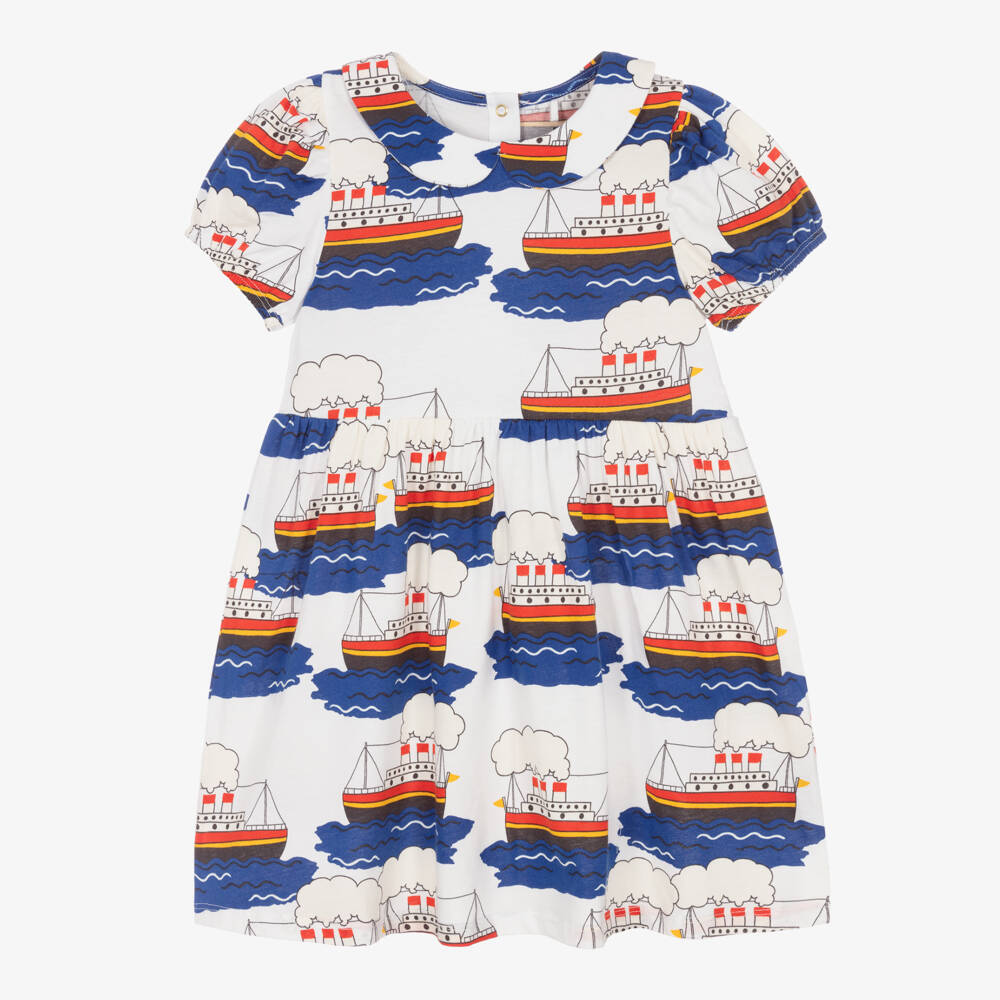 A fun white dress for girls by Mini Rodini, made in the softest organic cotton jersey. Patterned in colourful ferry boats, this dress has a Peter Pan collar and elasticated puff sleeves. There are useful popper fastenings on the back.