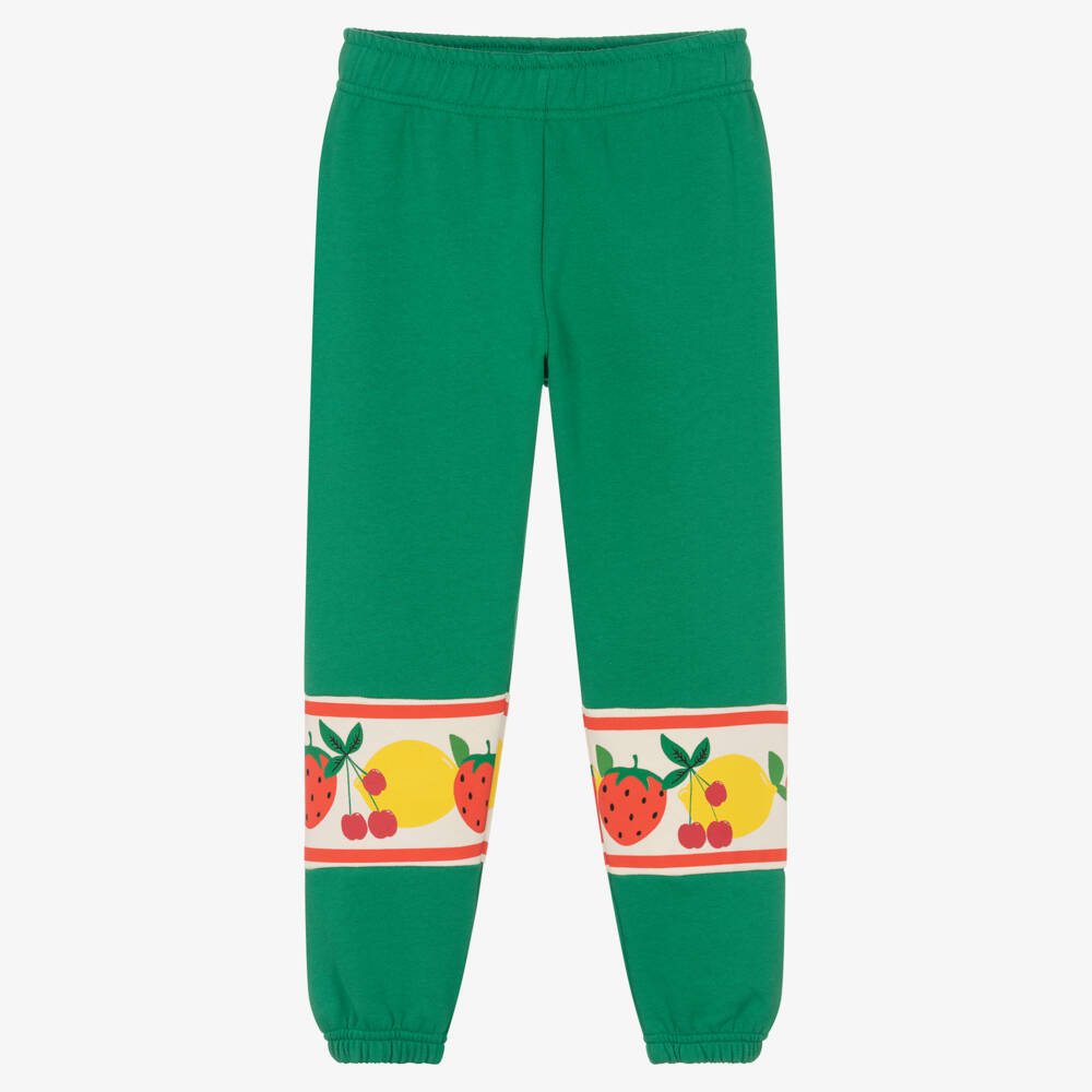 Green joggers for boys and girls by Swedish brand Mini Rodini, made from soft organic cotton jersey. In a cool retro style, they have ivory panels around each leg, printed in a variety of delicious fruits - including strawberries, cherries and lemons. There is an internal drawstring waistband, making them comfortable for lounging.