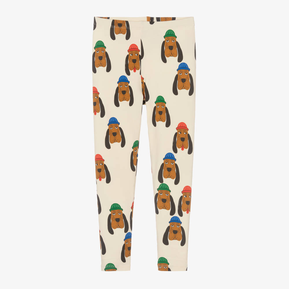 Ivory leggings for boys and girls by Mini Rodini, made from soft organic cotton jersey. Great for easy dressing, these casual leggings are patterned with brown hound dogs wearing bright red, green and blue hats. They have added stretch and an elasticated waistband for comfortable wear.