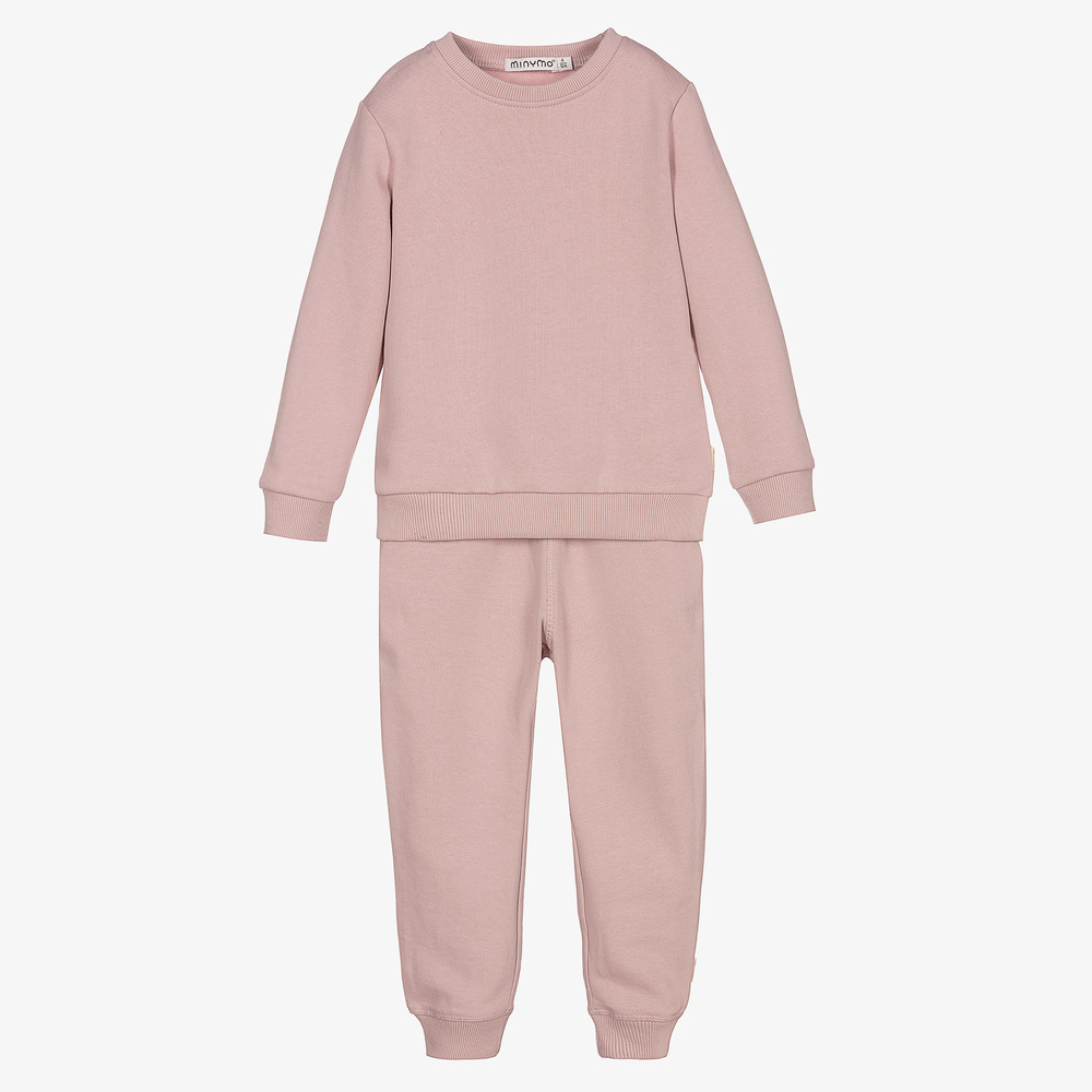 Lilac pink tracksuit for girls by Danish designer Minymo. It is made in soft cotton jersey with a super soft fleecy inside and ribbed trims. Both the sweatshirt and joggers have the brand's logo tab on one side seam. The joggers have a useful ivory drawstring on the waistband and jetted front pockets.