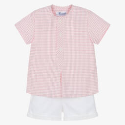 From Spanish brand Miranda, a white and blue cotton shorts set for baby boys. Ideal for warmer days, these lightweight pieces have red anchor detailing for a coordinated nautical look.