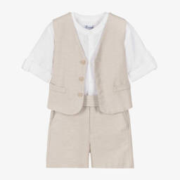 A charming, green waistcoat suit for little boys by Miranda, made in lightweight linen and cotton blend. The smart waistcoat and shorts are fully lined for comfort. The ivory collarless skirt has pintuck detailing and a green bowtie can be attached to the top button to complete the look.