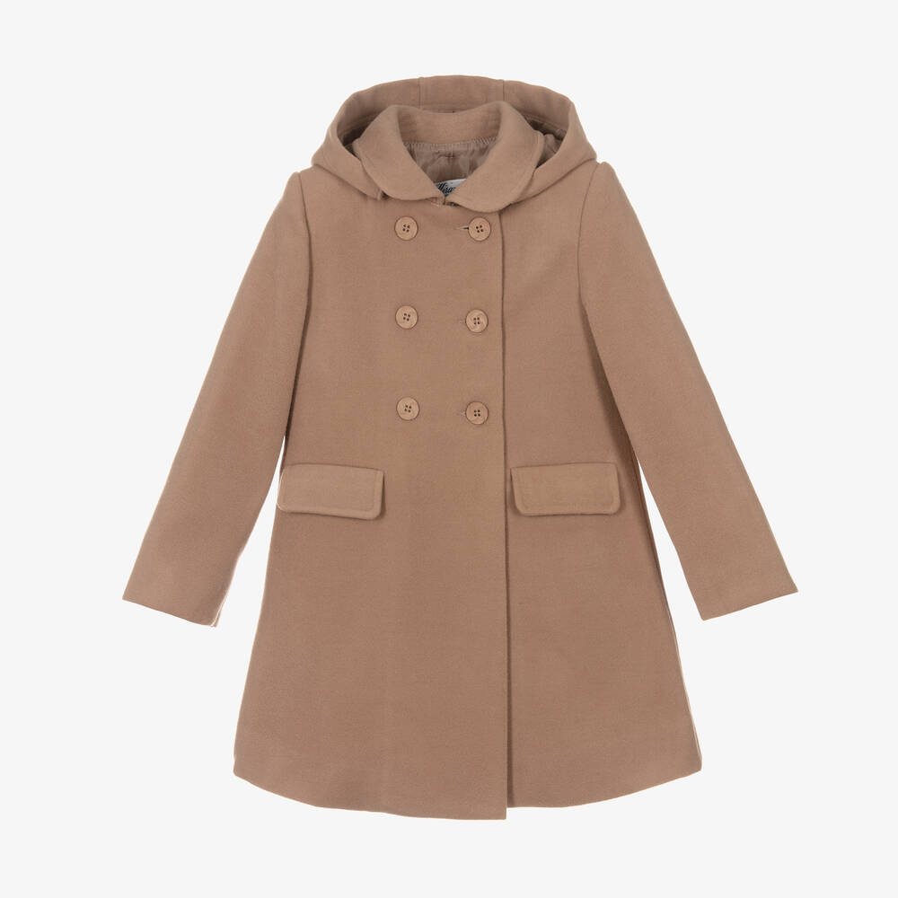 A traditionally styled, button-fastening beige coat for girls by Spanish brand Miranda, made from soft, felted fabric with a satin lining. For a gentle A-line silhouette, this double-breasted style has an inverted pleat on the back with a decorative button tab detail. A small collar, front flap pockets and a detachable hood complete the look.