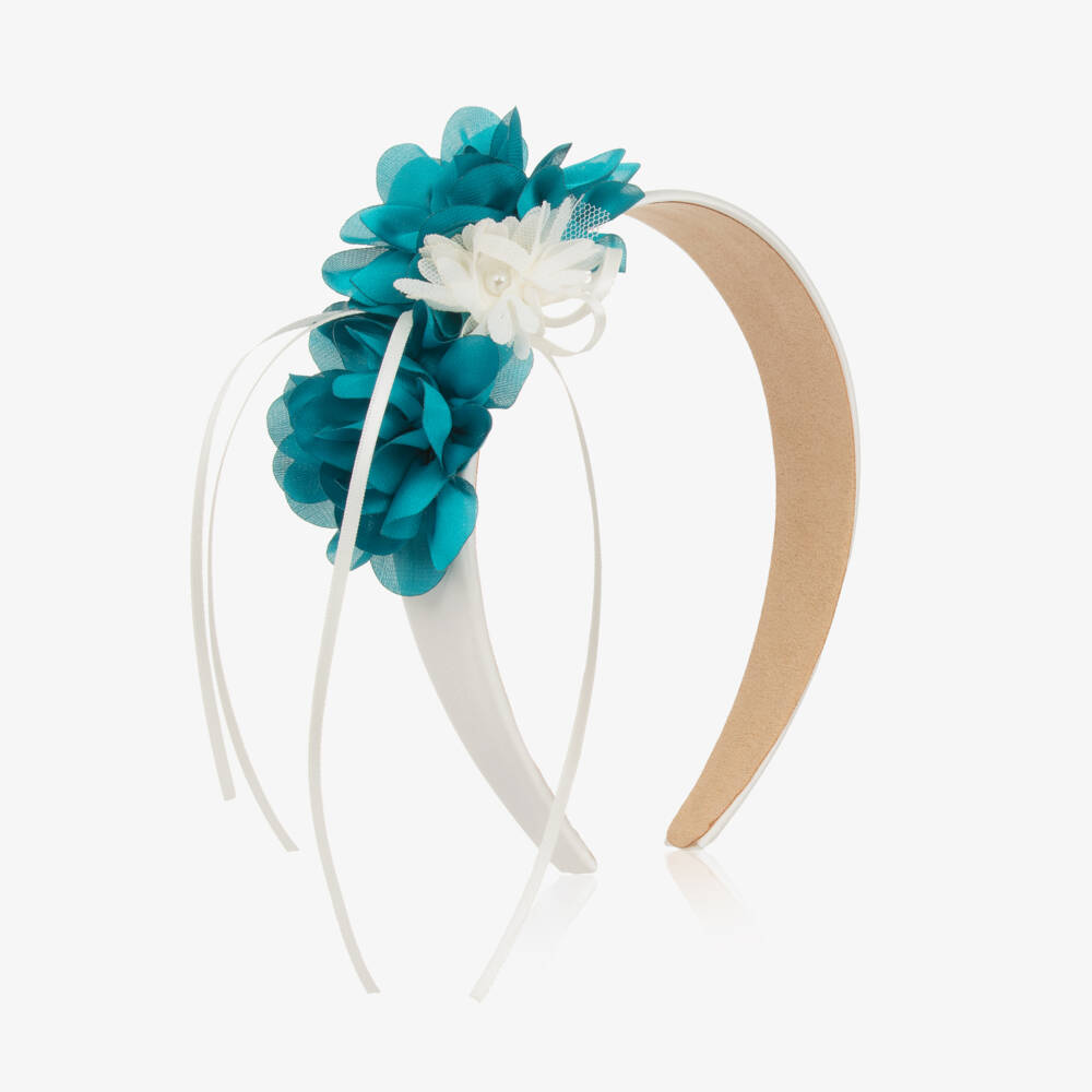 Elegant ivory and teal blue satin hairband for girls by Miranda, ideal for a special occasion. The wide, flexible band is topped with beautiful floral appliqués, a pearl bead and satin ribbon.