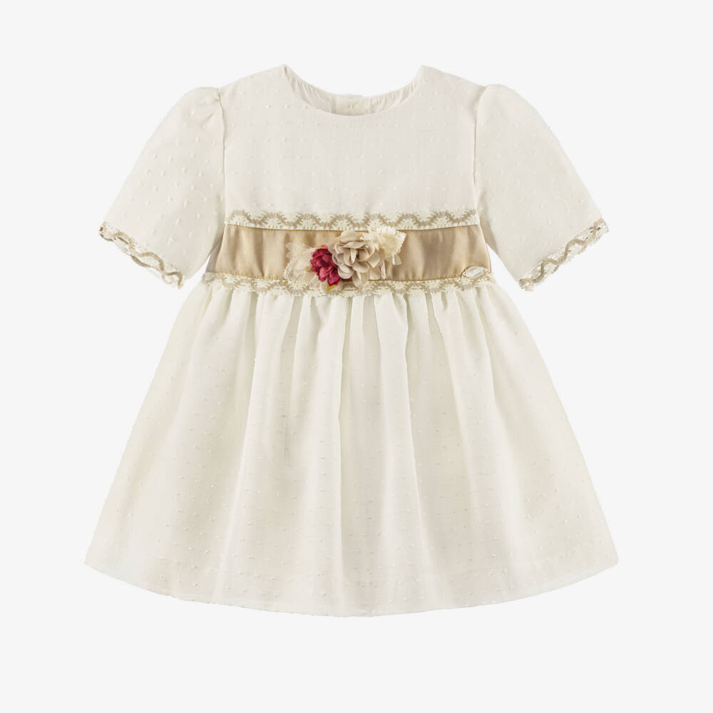 Очаровательное кремовое платье для девочек от Miranda из слегка текстурированной ткани плюмети и с подкладкой для комфорта. Это изысканное изделие украшено фиксированным бежевым поясом с нежной кружевной отделкой и съемным цветочным декором. Застегивается на пуговицы сзади и имеет расклешенную юбку для классического силуэта.