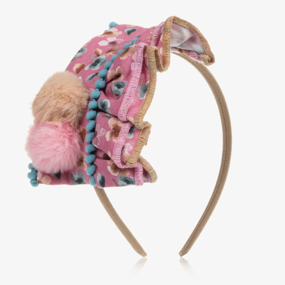 Elegantly finishing an outfit, this pink and beige hairband for girls is by Spanish brand Miranda. This lovely accessory has a ruffled floral decoration with blue trims and fluffy pom poms. It is set on a beige fabric-covered band, which is flexible for comfort.
