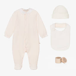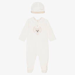 Baby girls ivory tulle and lace shortie and bonnet set by Miranda, offering timeless charm with its delicate design. The shortie has scalloped lace trim on the collar and sleeves, and beautiful embroidery across the chest. Lined in lightweight voile for comfort, it fastens with buttons on the back and between the legs. The matching bonnet adds a charming touch, with a button-fastening strap for secure wear.