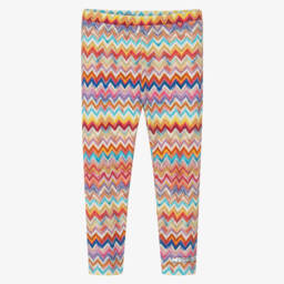 Stylish pink leggings for little girls by Missoni, featuring the brand's distinctive zigzag pattern in shades of pink and orange. Made in soft, stretchy jersey, they offer both comfort and style, with an elasticated waistband for easy wear.