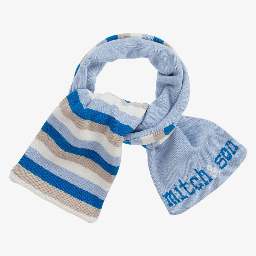 Blue, ivory and beige scarf for boys by Mitch & Son, knitted in a soft cotton blend. It is pale blue with the brand's woven logo on one end, and stripes on the underside.