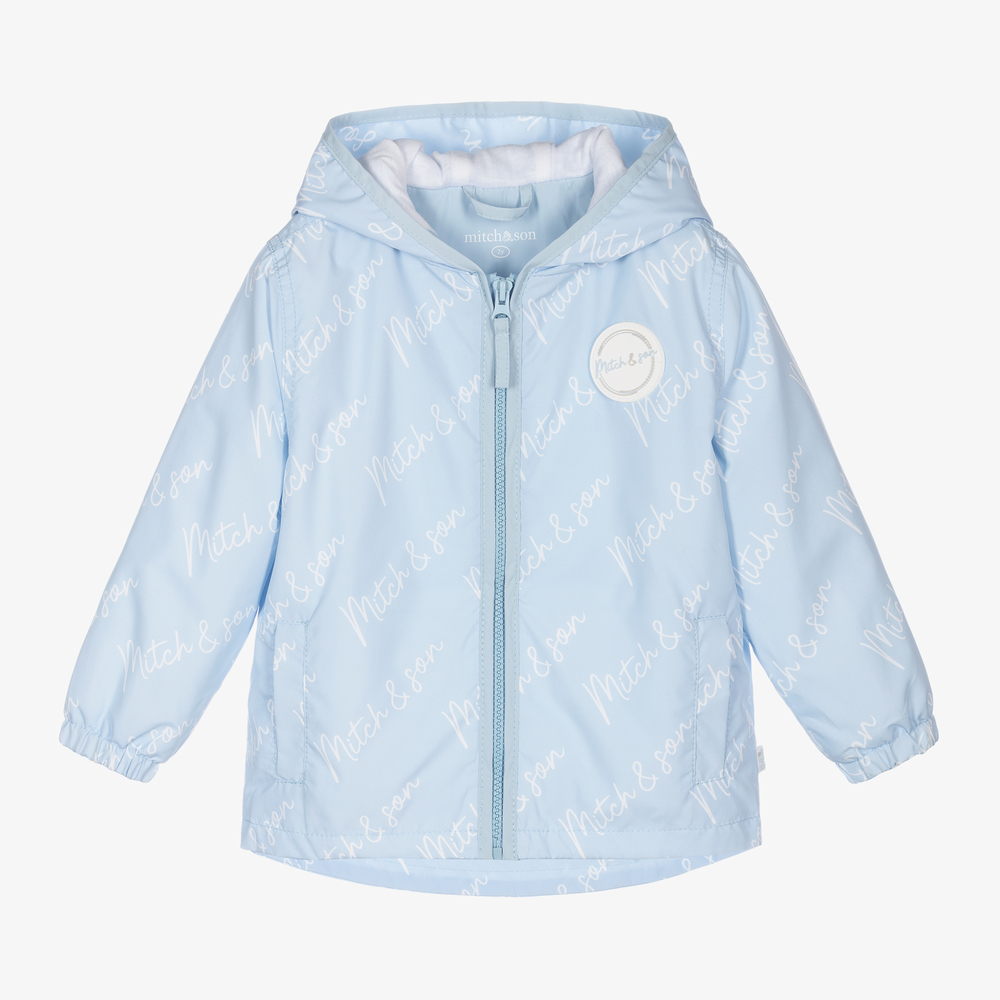 Pale blue hooded windbreaker jacket for boys, by Mitch & Son. Made in lightweight water repellent polyester, it has a rubberised logo badge on the chest, and a repeat script logo pattern all-over in white.