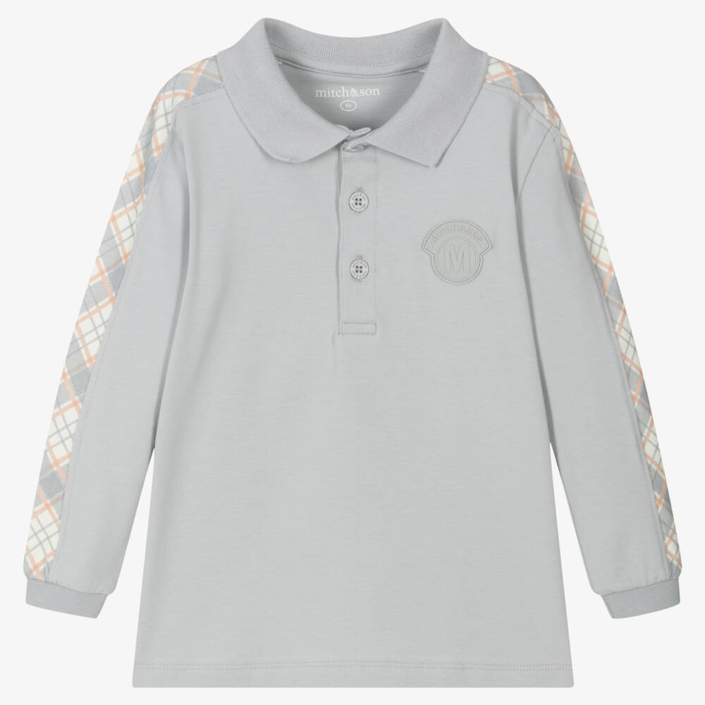 Grey long-sleeved polo shirt for boys by Mitch & Son, made in soft and stretchy cotton jersey. With classic polo styling, it has a ribbed collar, and branded button fastenings on the front. The sleeves are trimmed with a smart check pattern in grey, white and orange and for designer appeal, there is a rubberised logo patch on the chest.