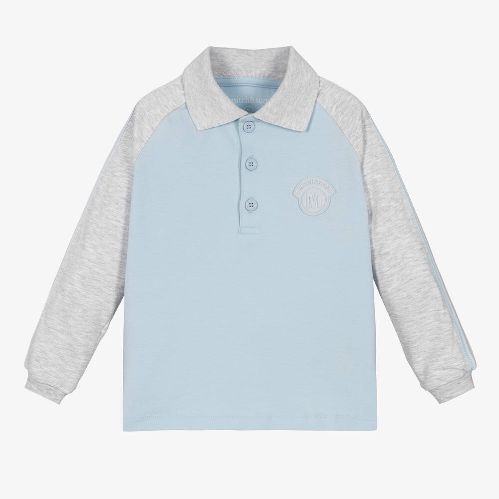 Light blue and grey polo top for boys by Mitch & Son, made in soft and stretchy cotton jersey. It has a classic ribbed collar and button fastenings on the front. There is a rubberised logo on the chest and sporty blue, white and grey striped trims on the long sleeves.