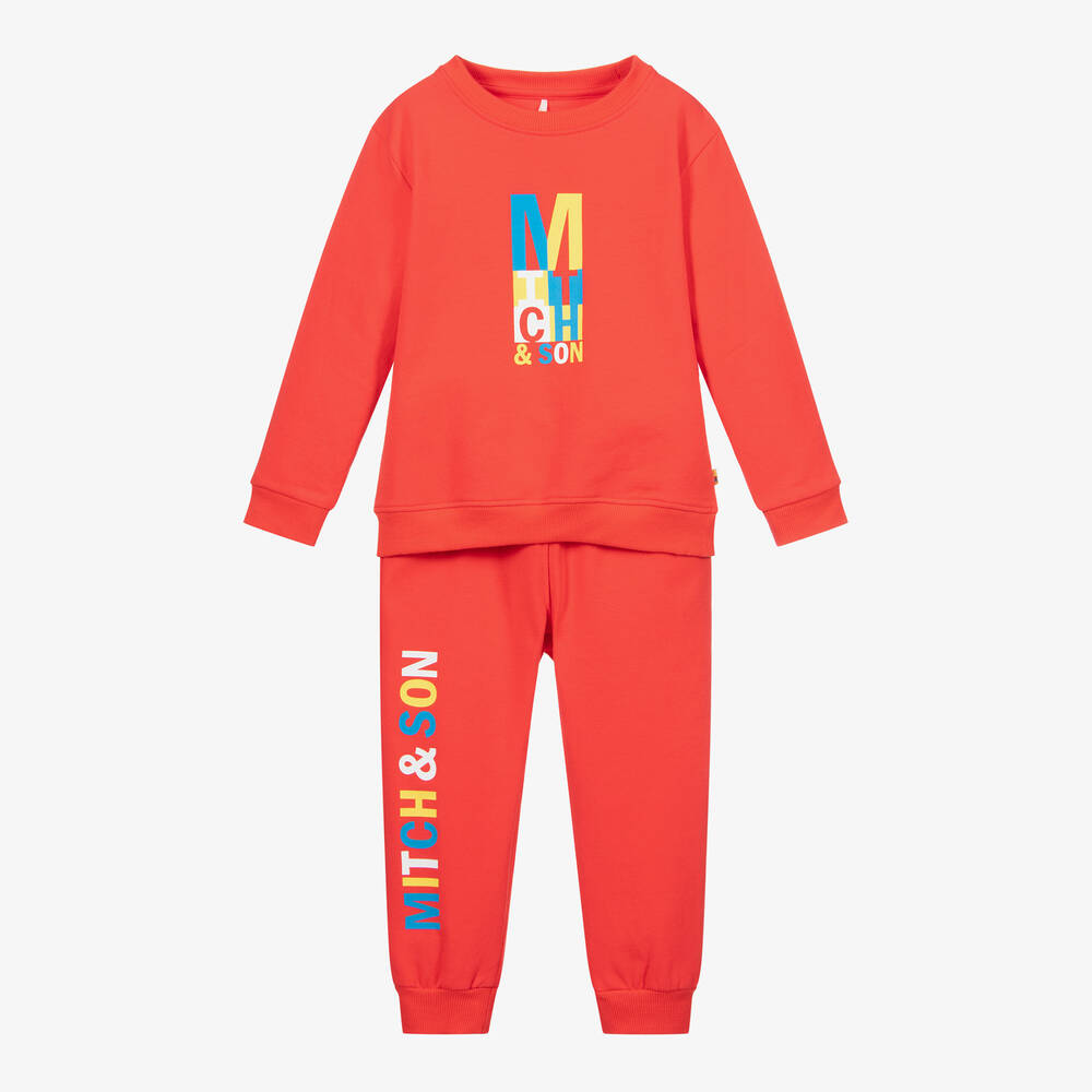 Boys red tracksuit by Mitch & Son, made in soft cotton jersey, with yellow, blue and white logo prints. The joggers have pockets and an elasticated drawstring waist.