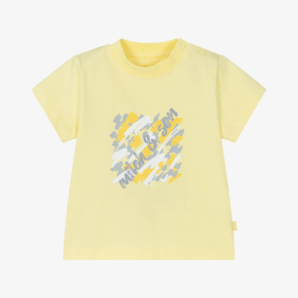 A pastel yellow cotton T-shirt for younger boys by Mitch & Son. Casual and comfortable, it has a grey and white scribble logo design on the front. Smaller sizes come with shoulder poppers for easy dressing.