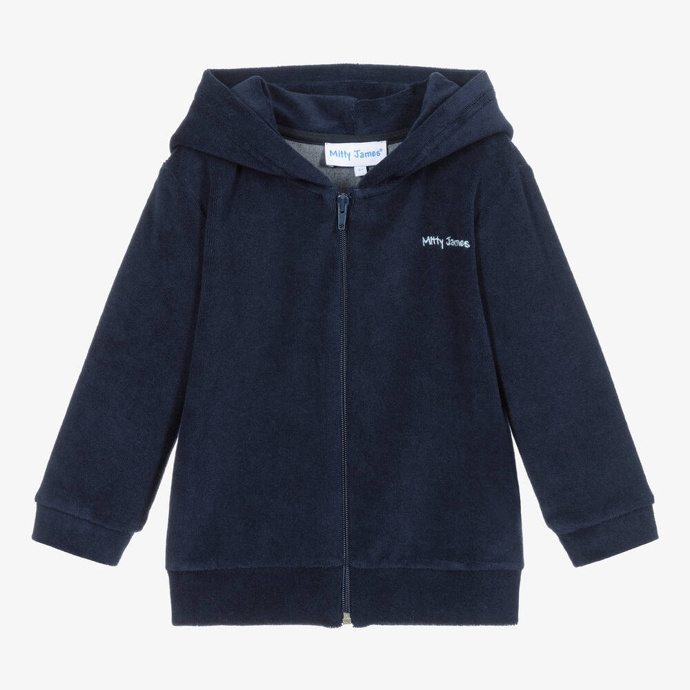 Exclusive to Childrensalon, a navy blue zip-up hoodie for boys and girls by Mitty James. Ideal for the beach or poolside, it is made in lightweight, absorbent cotton towelling with ribbed trims. The brand's logo is embroidered in pale blue on one side.
