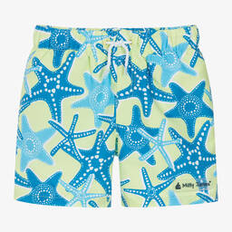Exclusive to Childrensalon, a pair of red swim shorts for boys by British brand Mitty James, with a fun starfish pattern in shades of blue. Soft and silky, they have a drawstring waist for a good fit, useful concealed side pockets and a mesh lining for comfort. There are handy eyelets around the back to allow water from the pool or sea out easily. For an instantly recognisable look, there is a rubberised logo badge on one leg.
