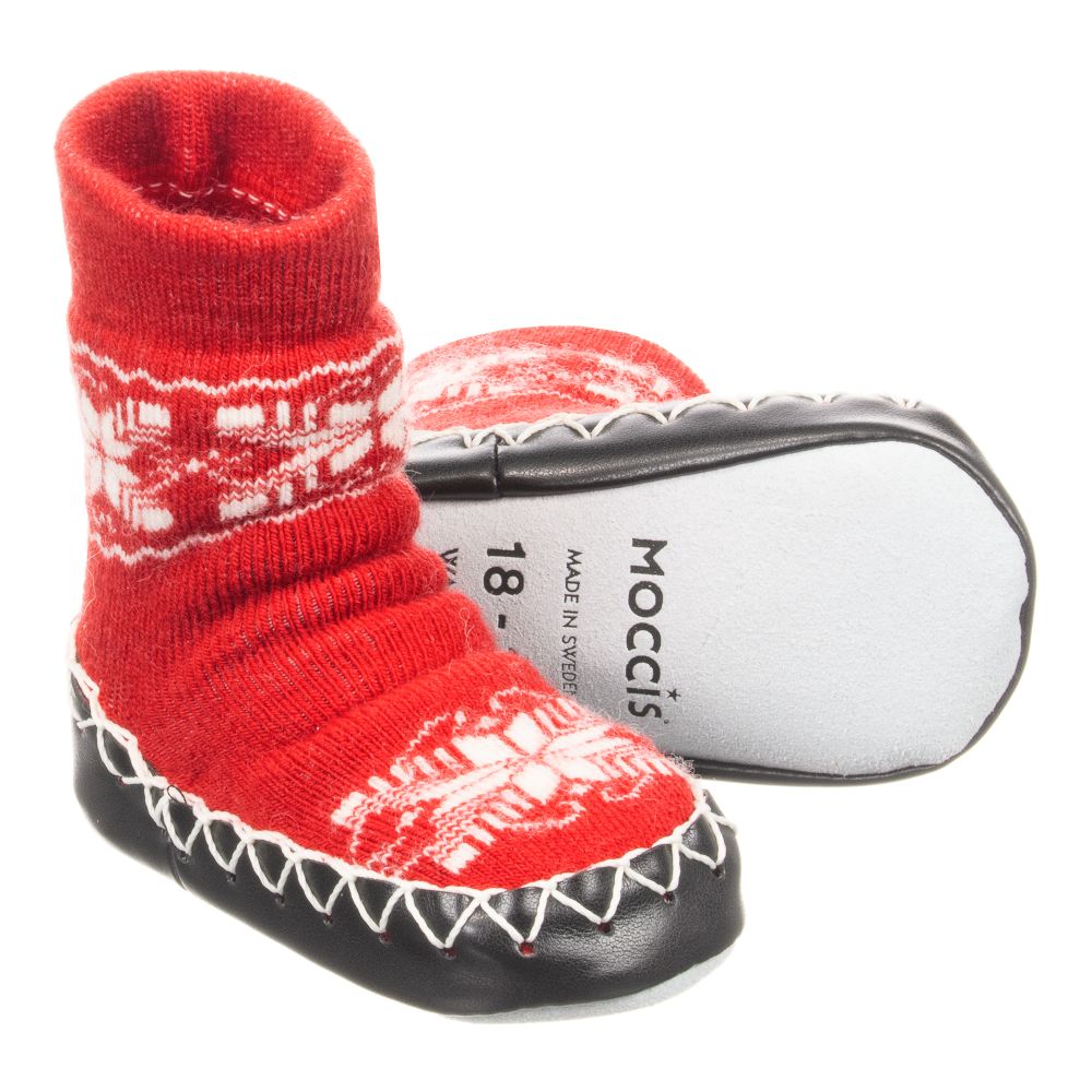 Red and ivory Fair Isle slipper socks by Moccis, made in a soft wool blend, for boys & girls. The durable and flexible leather sole allows the feet to move freely and the invisible elastic around the ankles of the stretchy sock helps prevent them from falling off. They make the ideal non-slip indoor shoe or slipper.