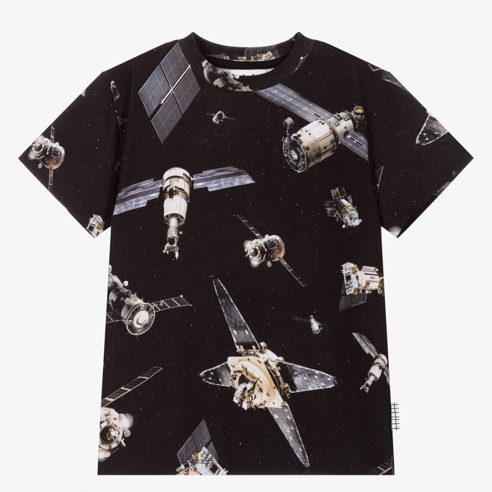 Black T-shirt for boys by Molo, made in soft and stretchy organic cotton jersey. It has grey and beige space satellite print on the front and a logo tab on one side seam.