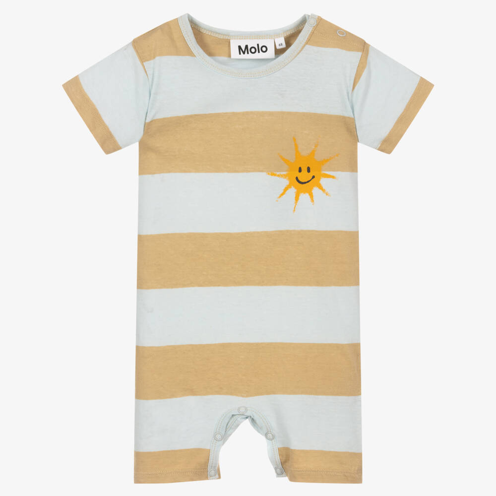 Cute pale blue and beige stripe shortie for baby boys and girls by Danish brand Molo, with a smiley sun printed on one side. Made in comfortable cotton and linen blend jersey, it fastens with easy-to-use poppers on the shoulder and between the legs for easy changes.