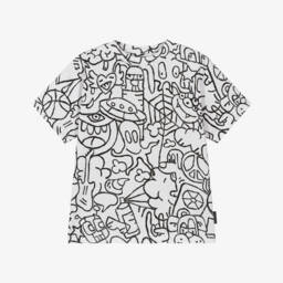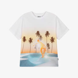 Blue short-sleeved T-shirt for boys and girls by Molo, swirled with a bright, tie-dye design. Made in soft organic cotton jersey, it has a happy smiling face printed on the front.