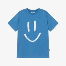 Синяя футболка для мальчиков и девочек от Molo из мягкого органического хлопкового трикотажа. Идеально подходит для комфорта на каждый день, имеет классический круглый вырез и белый смайл, напечатанный спереди, для веселого и игривого образа.
