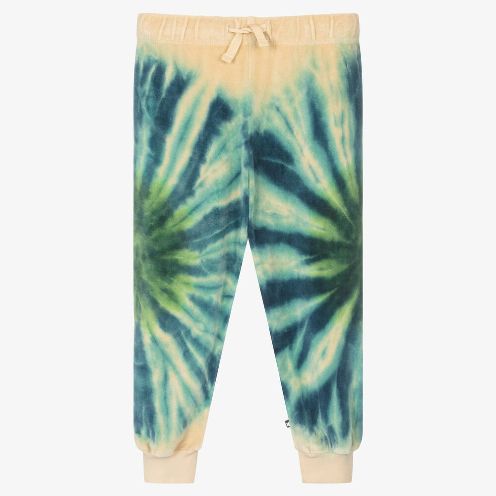 In a fun blue and green tie-dye pattern, these organic cotton joggers for little boys and girls are by Danish brand Molo. Made in soft and cosy velour, they have ribbed ankle cuffs and an elasticated drawstring waist for a comfortable fit.