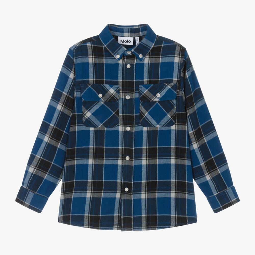 Синяя и темно-серая рубашка для мальчиков от Molo из мягкого и уютного органического хлопка фланель. Застегивается на пуговицы спереди, свободного кроя, с нагрудными карманами на пуговицах.