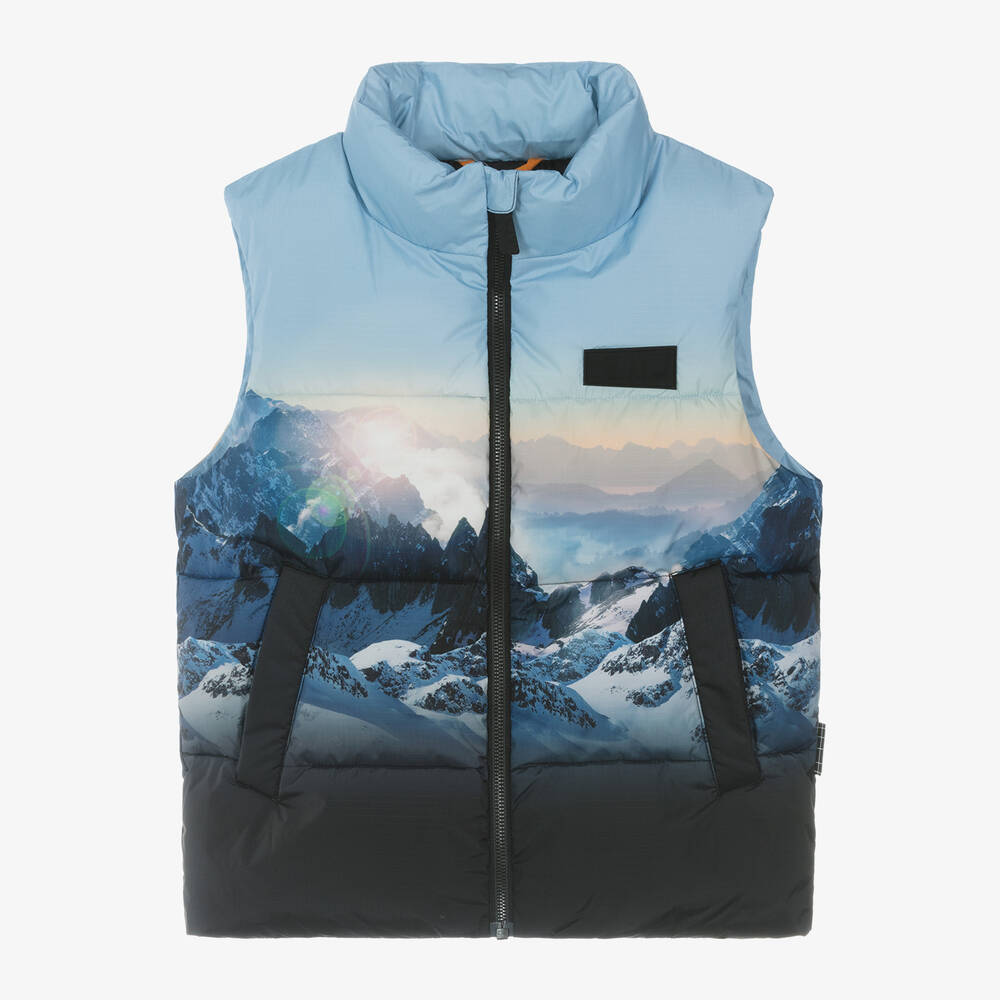 Утепленный жилет-пуховик для мальчиков от датского бренда Molo с горным принтом в оттенках синего. Изготовлен из мягкой шелковистой переработанной ткани с водоотталкивающей отделкой без фтора, утеплен легким техническим пухом, поэтому он легкий и уютный. Высокий стоячий воротник согревает шею, а внутренняя утяжка по подолу обеспечивает дополнительную защиту от непогоды. Подкладка из мягкого сатина для комфорта, застежка-молния с защитой для подбородка.