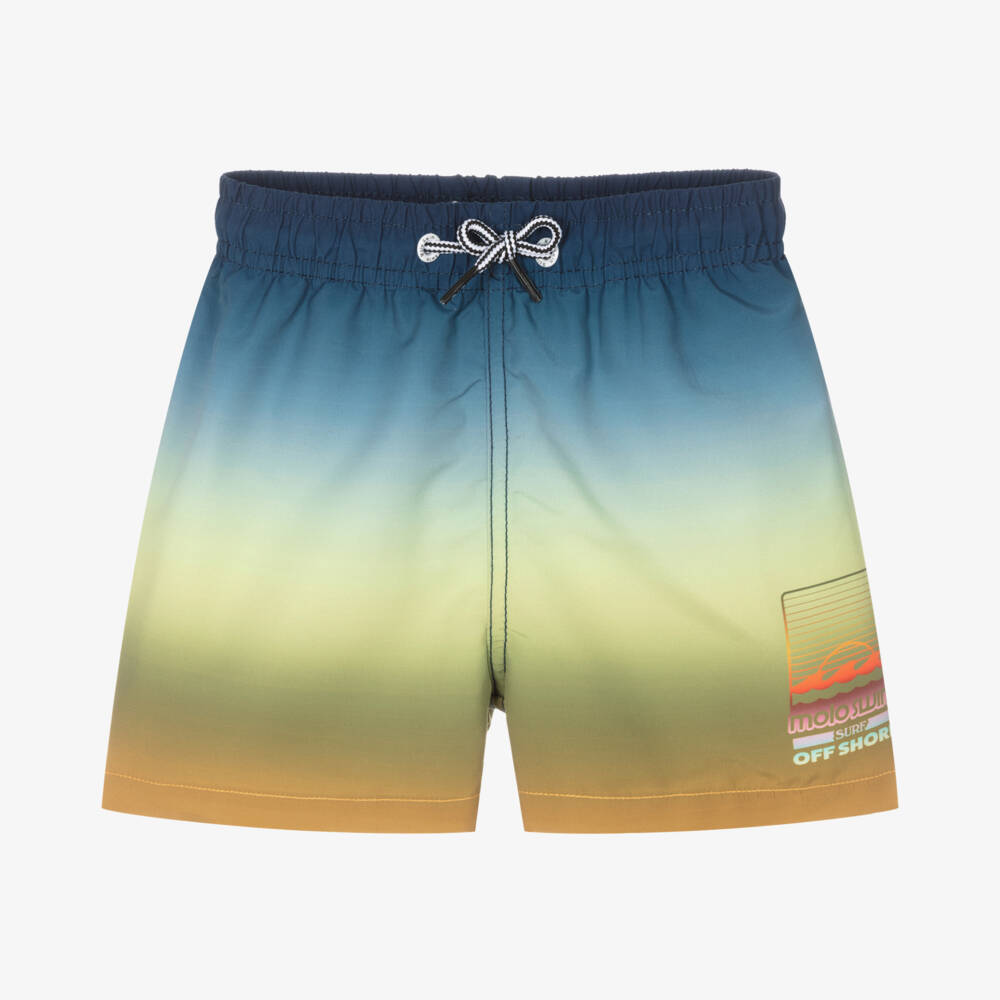 Striking navy blue swim shorts for boys from Danish brand Molo, with UPF 50+. Silky smooth they are lined with soft mesh for added comfort, and the elasticated waist can be adjusted via drawstring for a better and more secure fit. To stand out from the crowd, they are printed with an ombré fade into hues of yellow.
