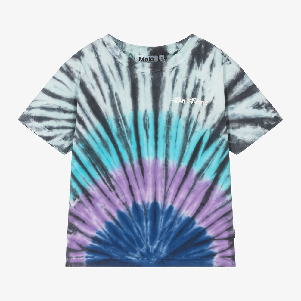 A cool blue T-shirt for boys by Molo, made from soft and stretchy organic cotton jersey. This casual short-sleeved top has a tie-dye pattern with an 'On Fire' slogan print for an urban look.