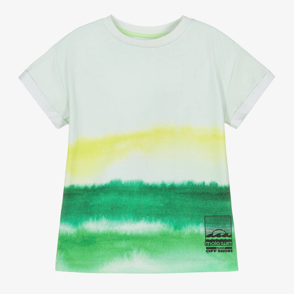 Green T-shirt for boys by Danish brand Molo, in a cool gradient stripe effect. Made in soft organic cotton jersey, it has turn-ups on the short sleeves and a ribbed crew neck. A black surf-themed logo print can be seen on the front to complete the casual look.