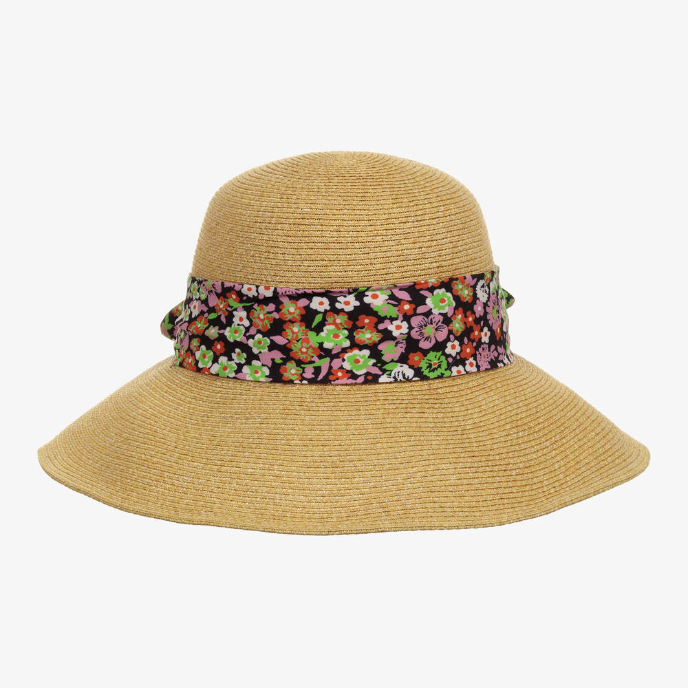 Lovely beige straw hat for girls by Molo, with a large brim, ideal for shading from the sun. This pretty hat also has black bow trim around the top, with a green, orange, and pink floral pattern.