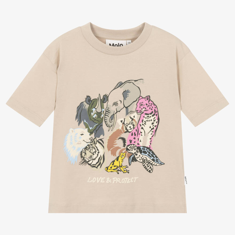 Beige organic cotton T-shirt for girls, by Danish brand Molo. Made in soft organic cotton jersey, it has a colourful animal print on the front with 'Love & Protect' printed underneath.