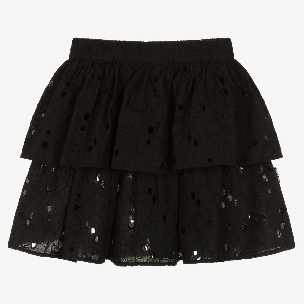 Black cotton skirt for girls by Danish brand Molo. This lightweight, tiered skirt is comfortable and casual with an elasticated waist. It is patterned with stunning broderie anglaise detailing and finished with a logo tab on the side for designer touch.