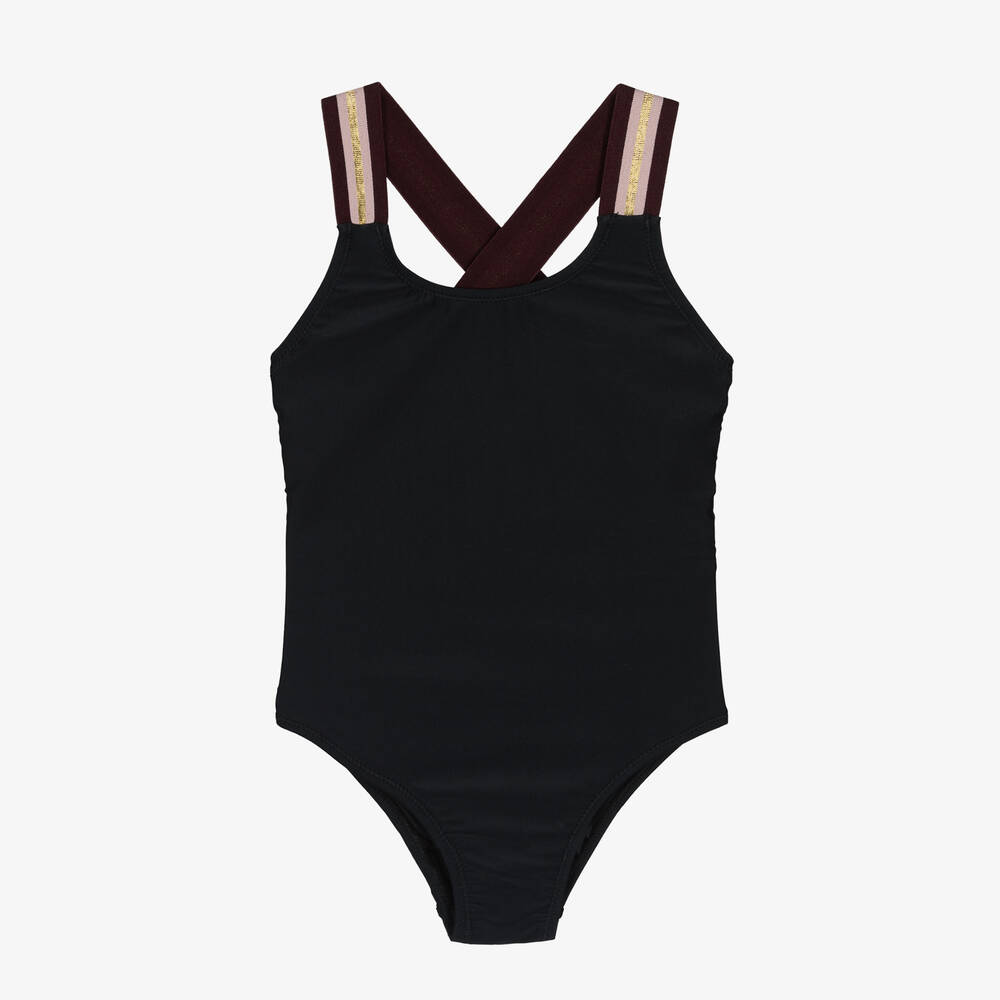 Timelessly stylish black swimsuit for girls from Danish brand Molo. Silky smooth and fully lined for added comfort, it has pretty burgundy red, pink and metallic gold striped cross-over straps and a low scoop back.