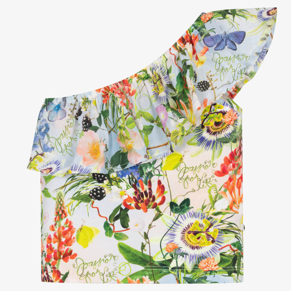 Stylish one-shoulder organic cotton top for girls by Molo, in pale blue with a colourful floral all-over print. The jersey body is stretchy and comfortable, with a pretty voile ruffle across the asymmetric shoulder, gently elasticated to keep it in place.