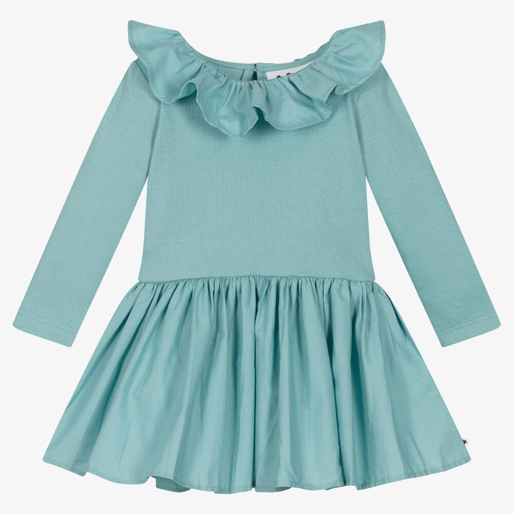 Lovely turquoise blue organic cotton dress for little girls by Danish brand Molo. This casual and comfortable dress has a soft ribbed jersey bodice with long sleeves. For a pretty finish, the full gathered skirt is made in a soft cotton poplin, matching the fun ruffle collar. There is a keyhole button fastening on the back and a subtle designer logo tab on one side seam.