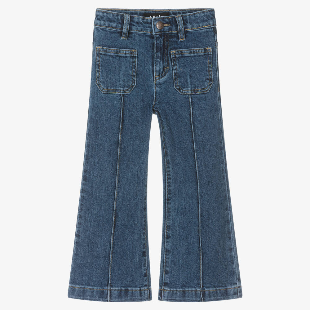 Stylish blue denim jeans for girls by Danish brand Molo, with added stretch of comfort. In an extra relaxed fit, these wide leg trousers have patch pockets and stitched seams on the front. There is an adjustable waist for an ideal fit, with a zip and branded popper fastening. A jacron logo patch on the back adds a finishing designer touch.