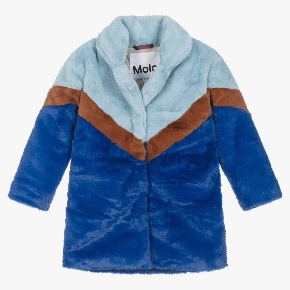 A light and dark blue faux fur coat for girls by Molo, in a fun brown colourblock pattern. It has a revere collar and concealed pockets for a chic yet stylish look. Fastening with poppers, a silky smooth lining comfortably finishes the design.