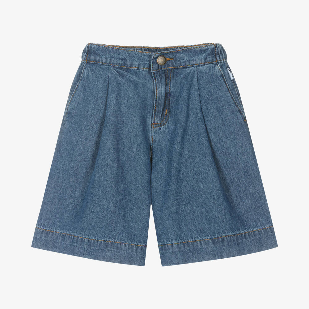 Washed blue bermuda shorts for girls by Danish brand Molo, made in a soft and lightweight organic cotton chambray. Designed for a wide-leg fit, they have a zip and popper fastening, pockets and a tag logo on the side for a 90's-inspired, vintage look. There is a comfortable elasticated waistband on the back.